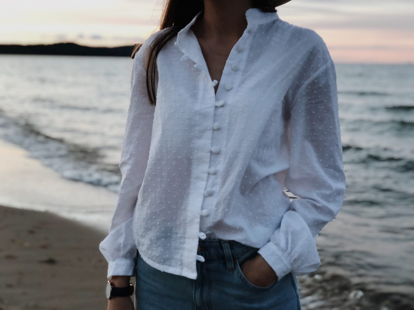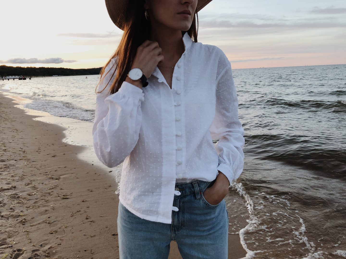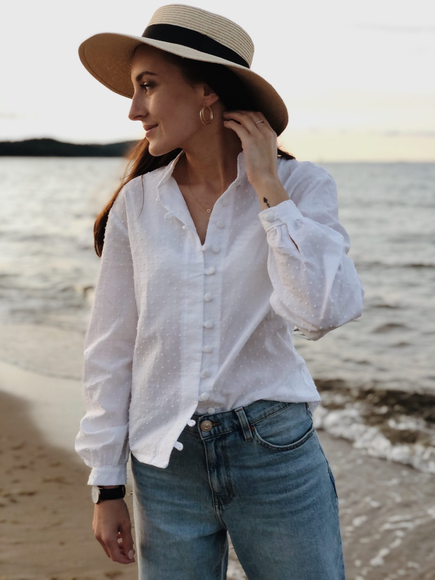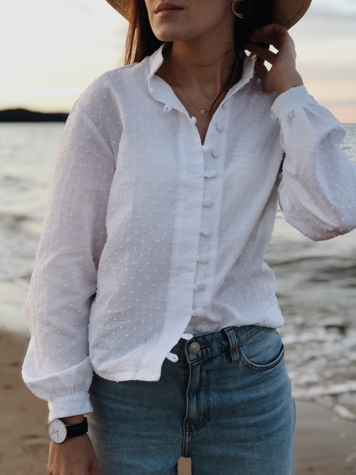 Dzisiaj prosto, klasycznie i meega detalowo. Biała bawełna 100% w małe kropeczki, to był strzał w 10. Prosta, bez zaszewek, ze stójką, z obszytymi guzikami i pętelkami. Mały mankiet z marszczeniami.