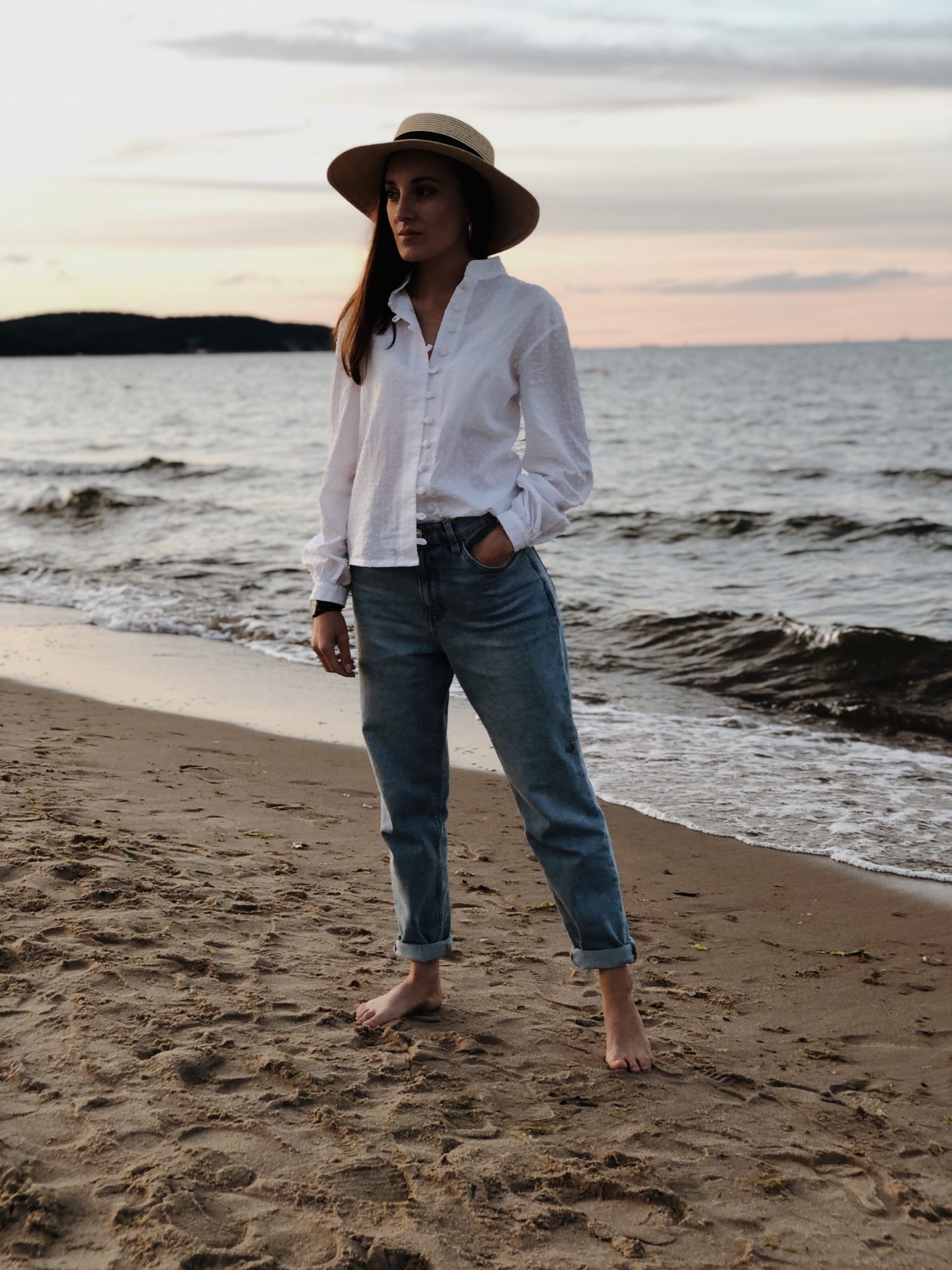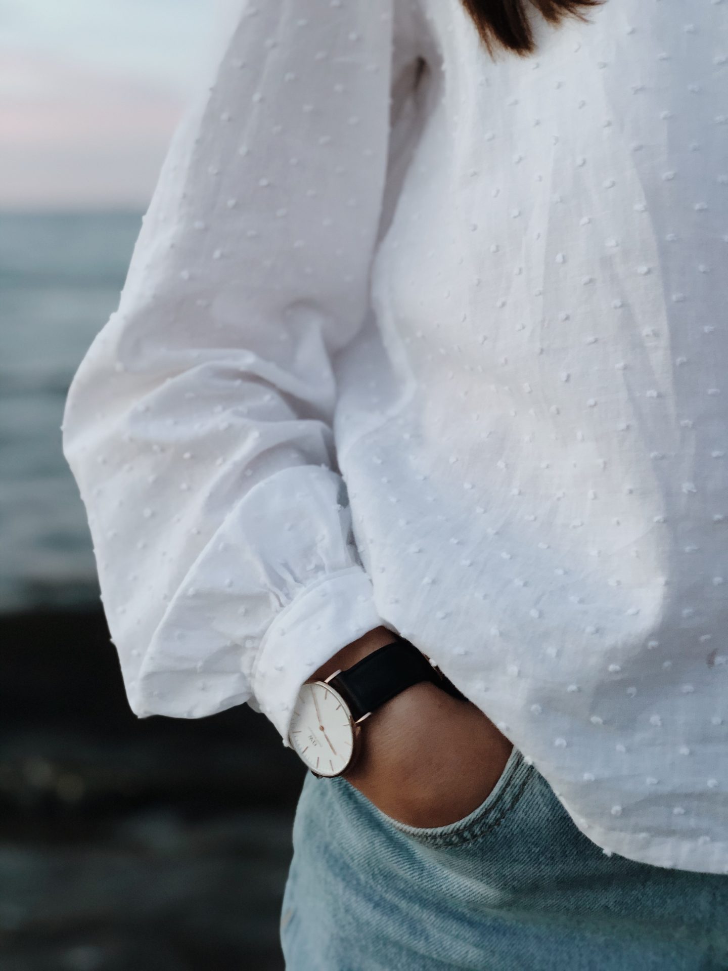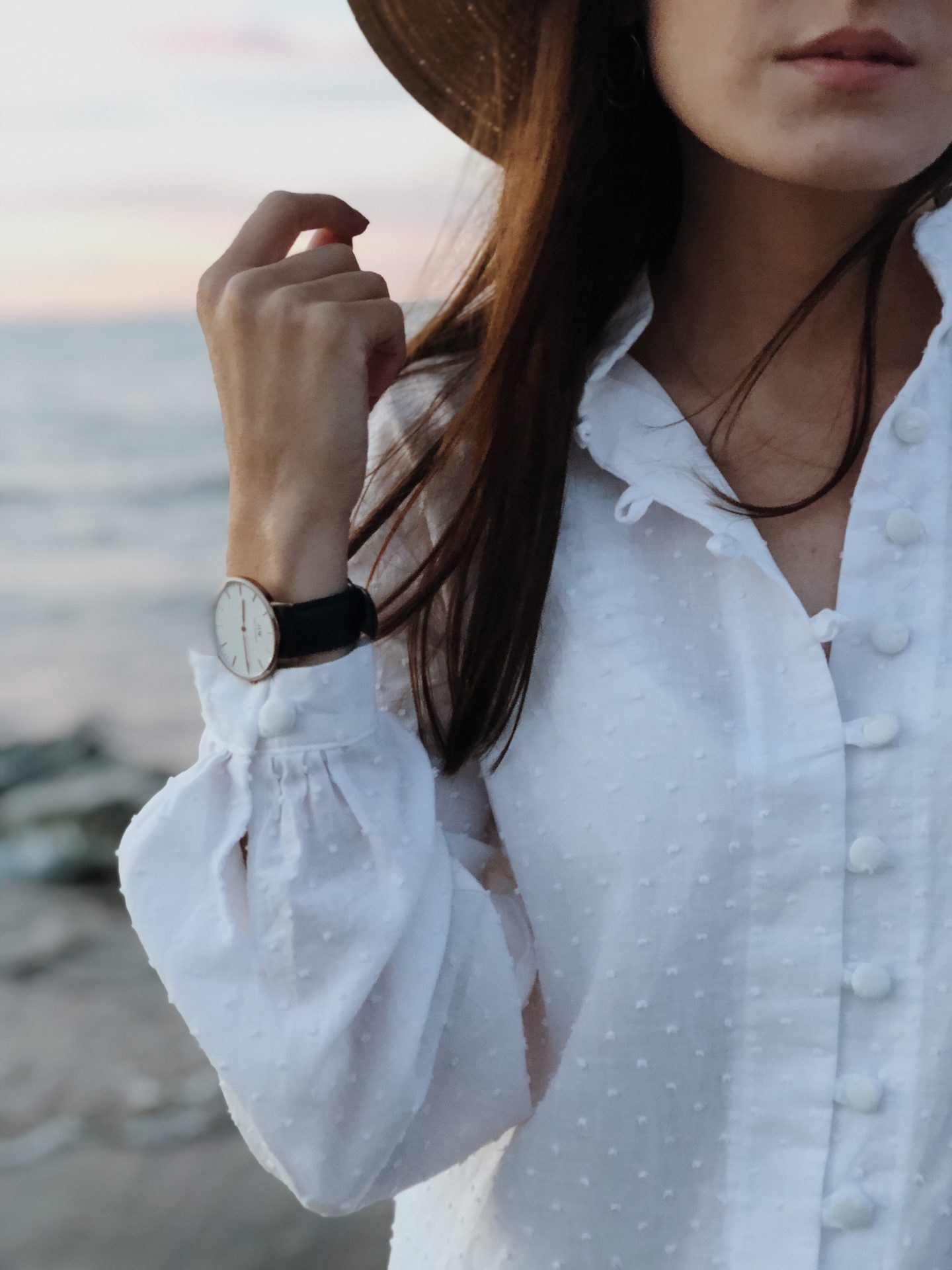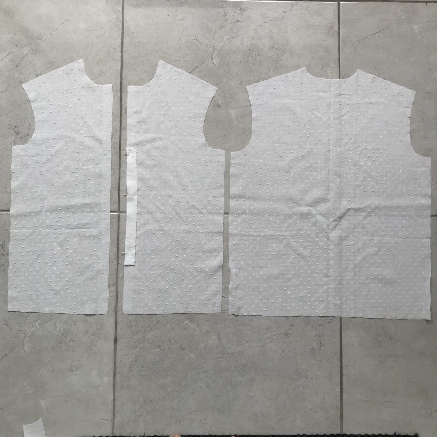 Dzisiaj prosto, klasycznie i meega detalowo. Biała bawełna 100% w małe kropeczki, to był strzał w 10. Prosta, bez zaszewek, ze stójką, z obszytymi guzikami i pętelkami. Mały mankiet z marszczeniami.
