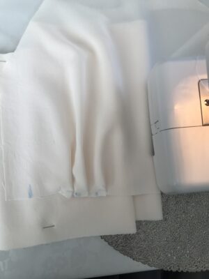 3. Drugim elementem są rękawy, ja wykończyłam je podwójnie złożonym paskiem, i przyszyłam prawą stroną do prawej, wywróciłam, zaprasowałam i obrzuciłam overlockiem. 🙂 To mój ulubiony rodzaj wykończenia. <3