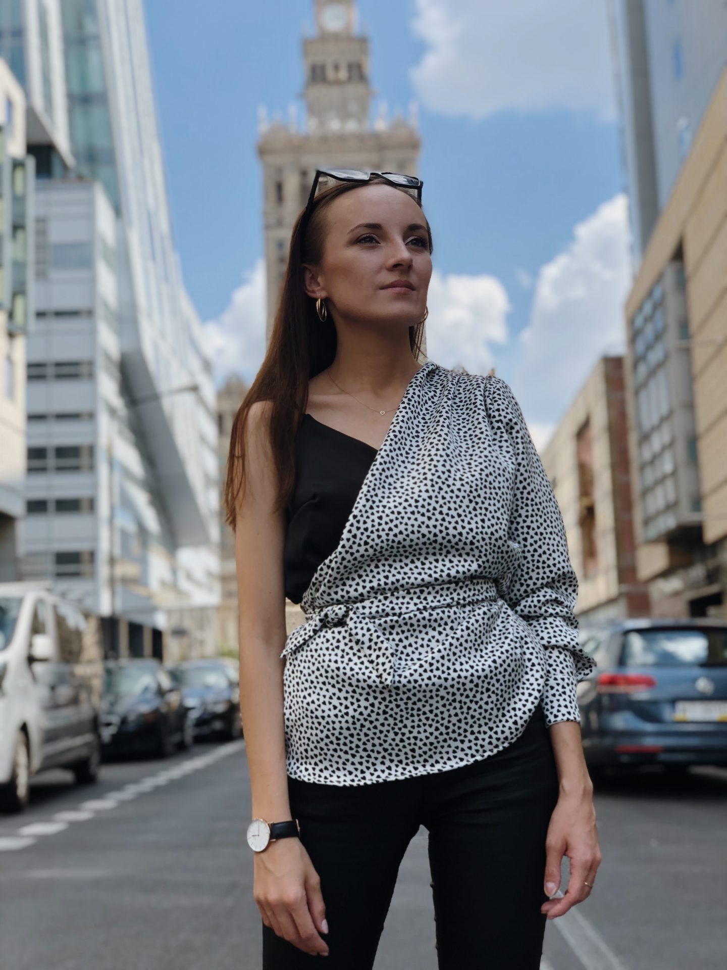 Koszula na jedno ramie, bez zamka, bez gumek. Pod spodem mam zwykły TOP CODZIENNY od joulenki. Pierwsza warstwa w serduszka to zmodyfikowany wykrój z burdy.