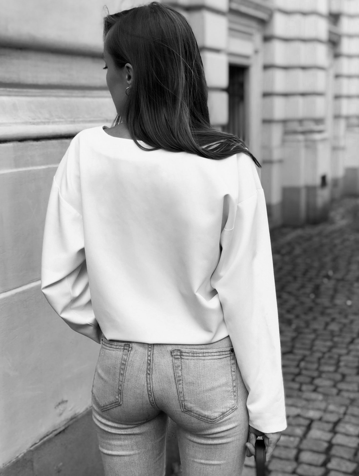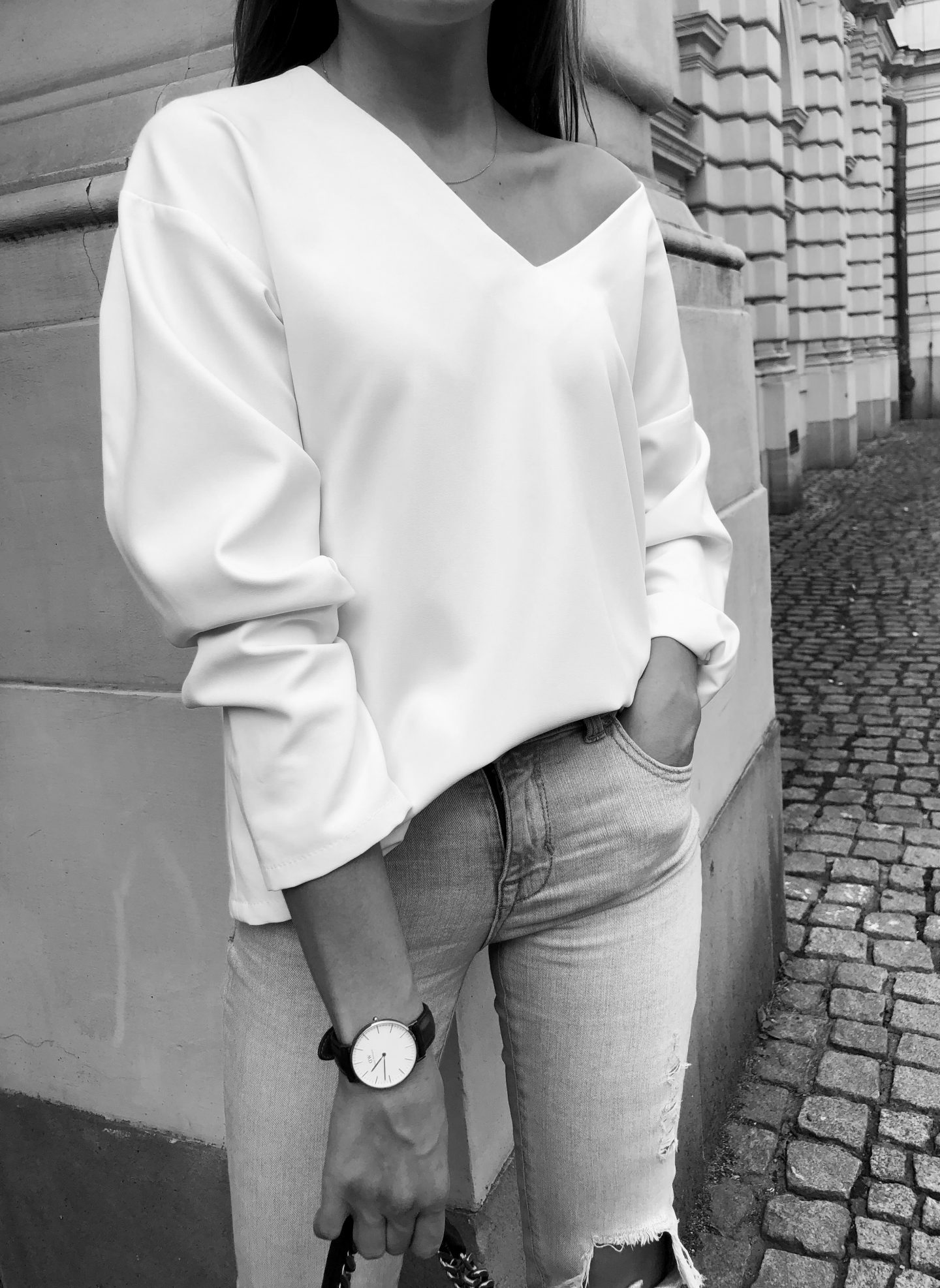 Dzisiaj klasyk z klasyków. <3 I choć tutaj dużego projektu nie ma… to chyba każdy z nas ma taki biały klasyk w szafie. Uratował mi niejedno “wyjście”. Fason trochę oversize, dzięki czemu pasuje do każdej sylwetki, jak i w zasadzie do wszystkiego. Najważniejsza jest tkanina, by po jednym praniu nie straciła swojej bieli. Do czego zakładać? Jestem miłośniczką superstarów jak i zarówno eleganckiego obuwia, takiego “babcinego” jak to mówi moja siostra… : ) więc, zakładam ją do jednego i do drugiego, do dresów, spodni, i spódniczki – w zasadzie do czego sobie tylko wymyślicie. : )