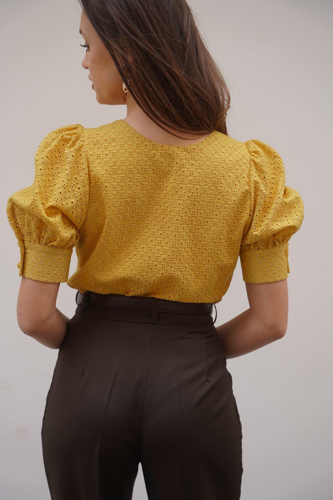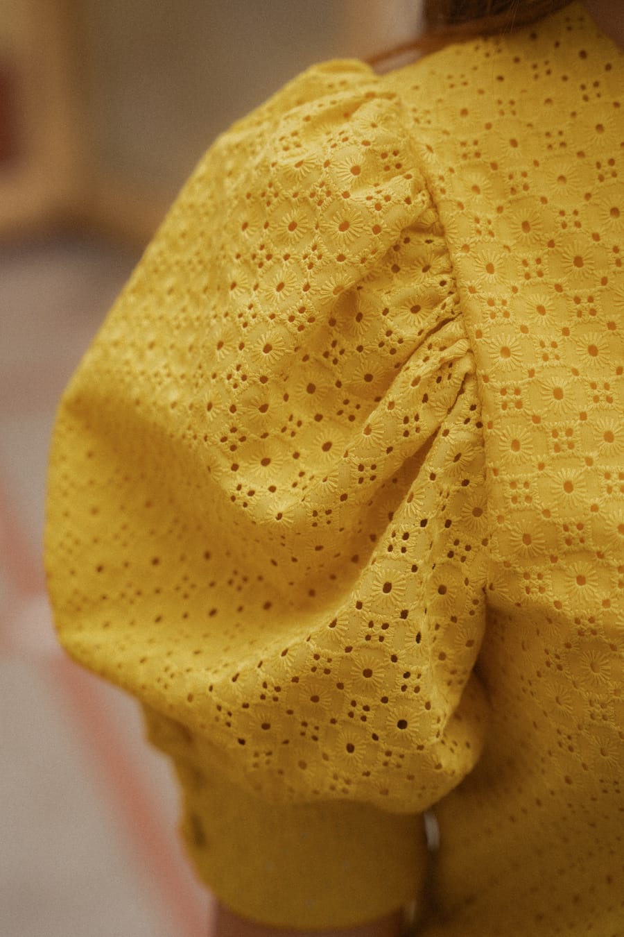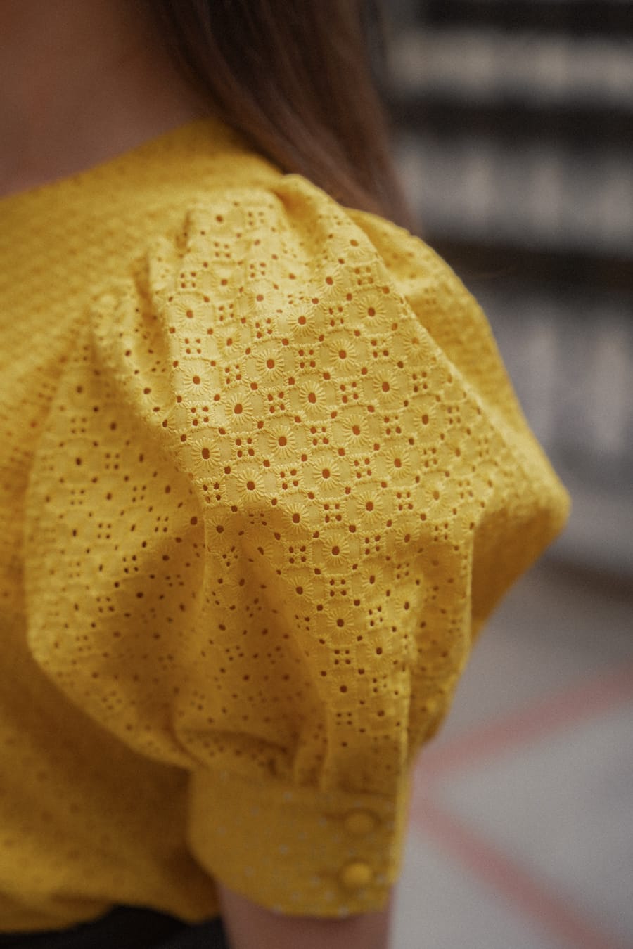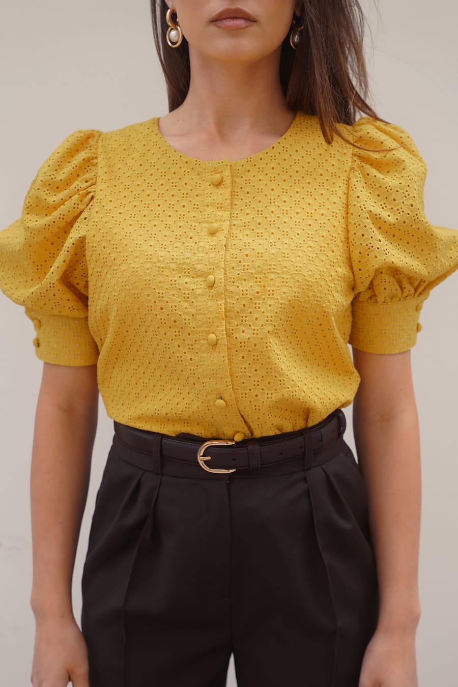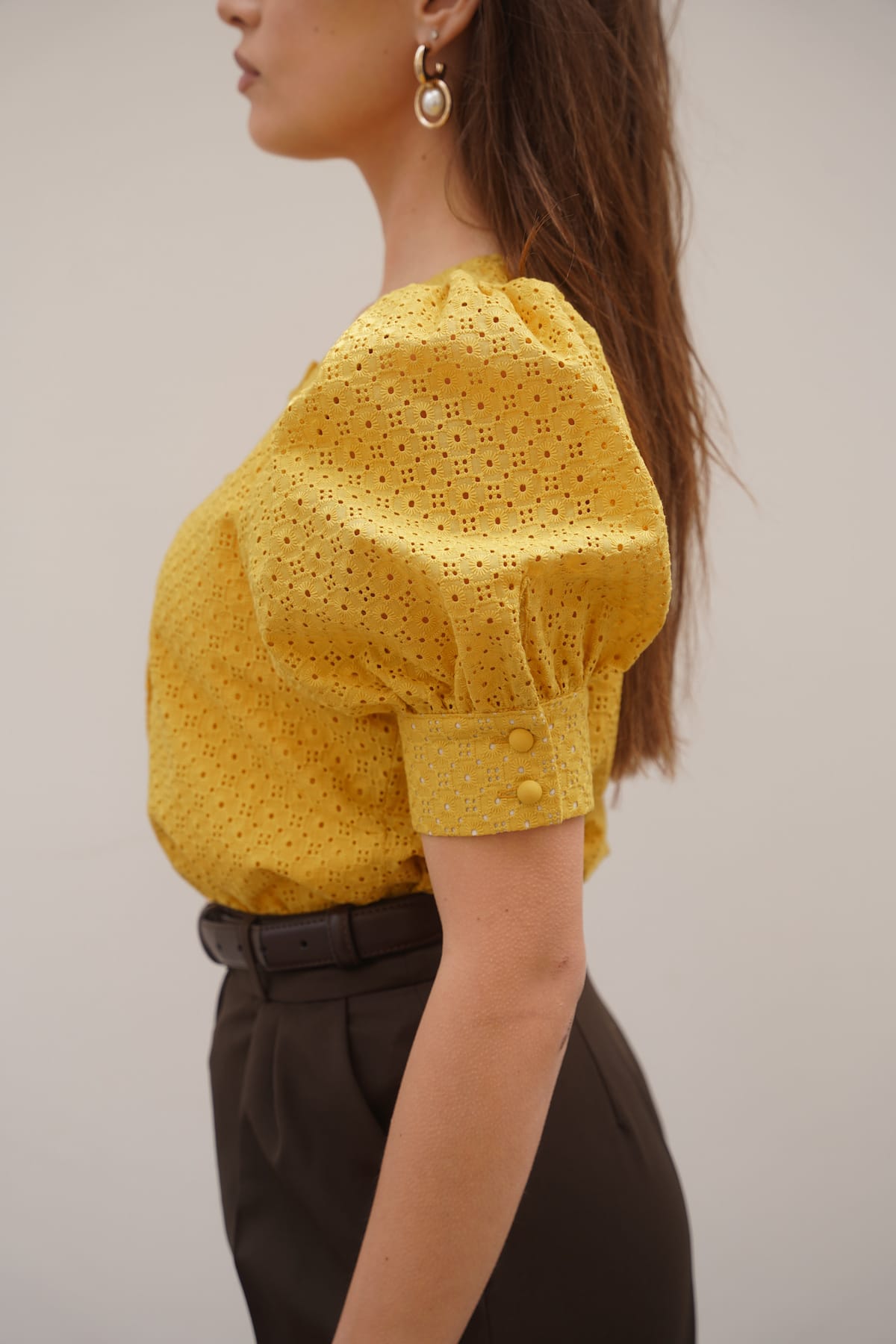 Letnia, kobieca bluzka uszyta z delikatnej, haftowanej bawełny w ciepłym, słonecznym odcieniu żółci. Posiada krótkie, bufiaste rękawy zakończone mankietem oraz elegancki, okrągły dekolt. Z przodu zapinana na oblekane guziki, które dodają całości subtelnego uroku. Naturalna tkanina zapewnia przewiewność i komfort noszenia w ciepłe dni, a ażurowy wzór wprowadza lekkość i romantyczny charakter. Z przodu i tyłu została wszyta podszewka. Idealna do zestawienia z jasnymi spodniami lub spódnicą — zarówno na co dzień, jak i na letnie okazje.
