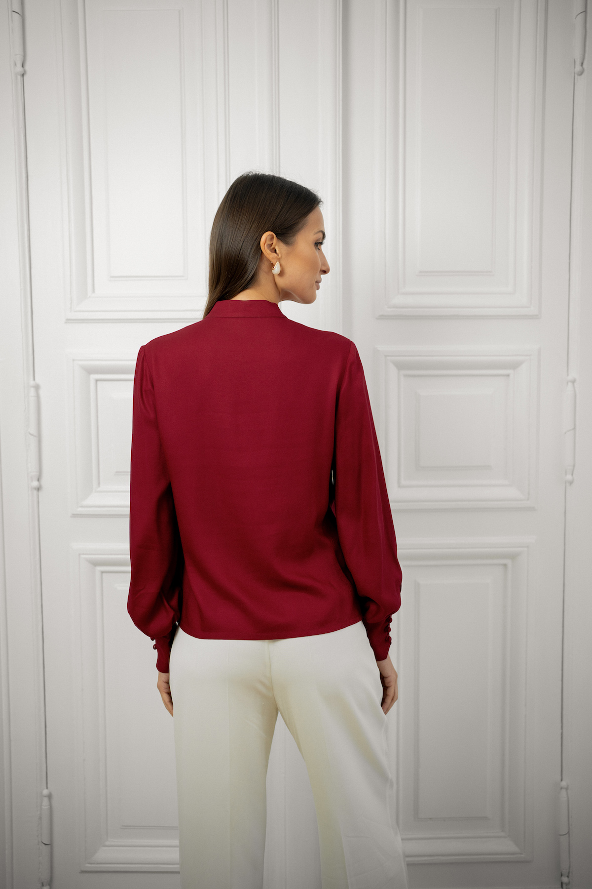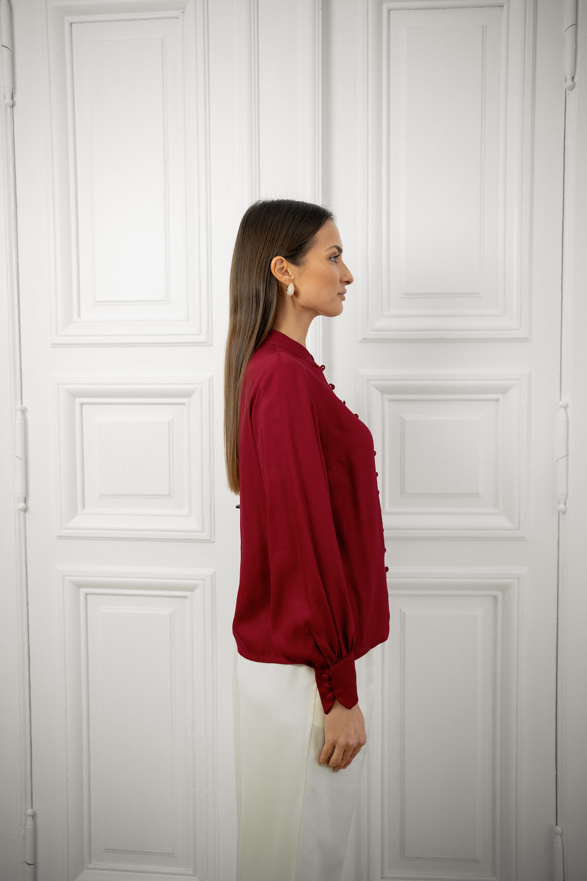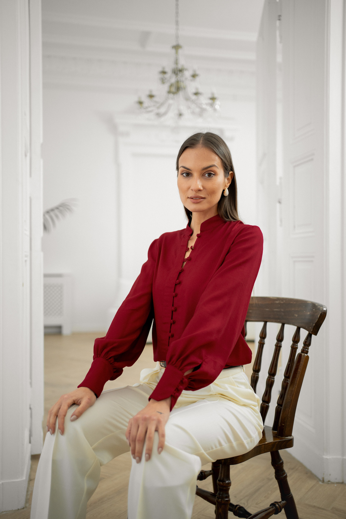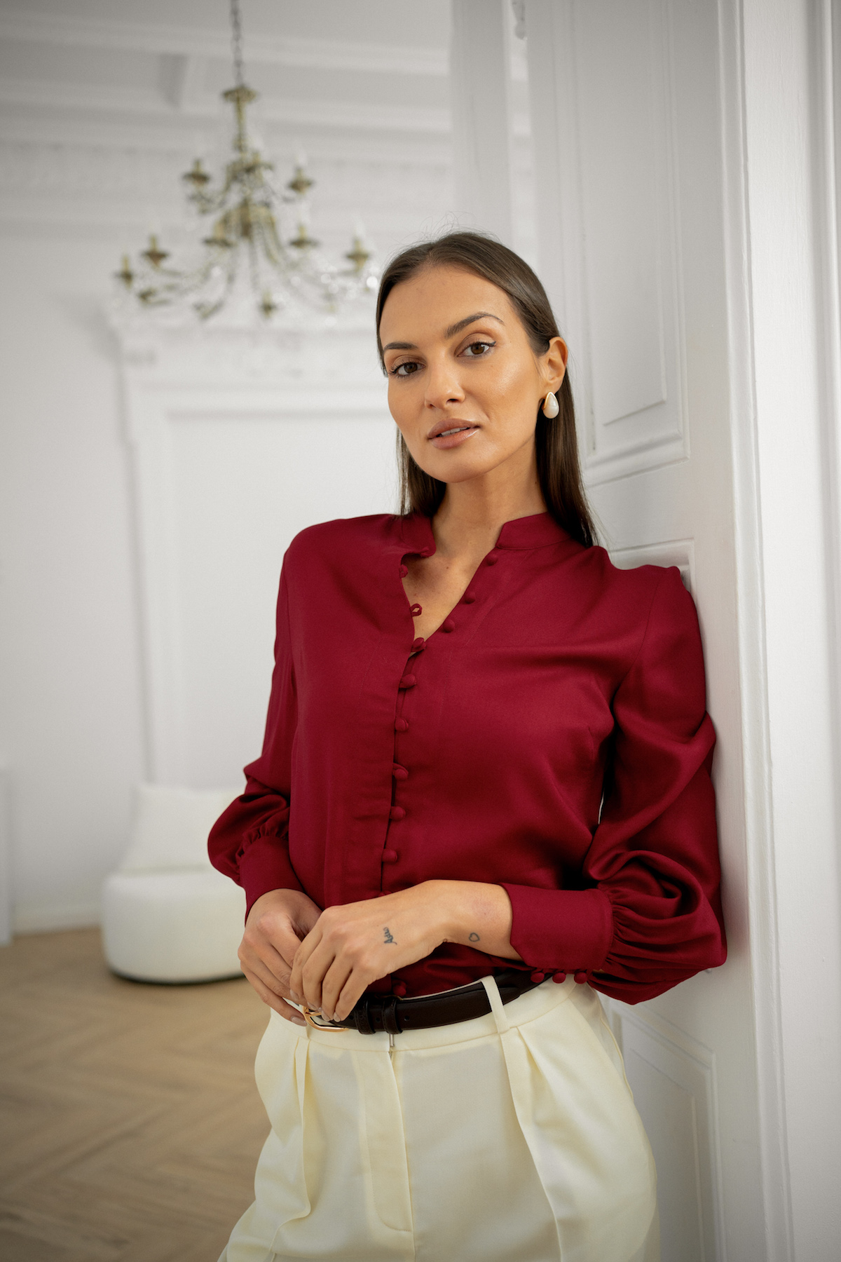 Poznajcie koszulę ETHC w odsłonie głebokiej czerwieni. Ta koszula damska to prawdziwy maestro w świecie mody. Jest bardziej urzekająca niż koci pazur na wybiegu. Gwarantuje nie tylko stylowy look, ale również zawsze modną elegancję. Ale czym tak naprawdę jest ta super koszula? To nie jest zwykły kawałek tkaniny – to włoska wiskoza, wykończona delikatną półmatową warstwą. To koszula z delikatną stójką i rządem oblekanych guziczków. Jej mankiety są zakończone skosem, zapinane na obleczony guziczek, który subtelnie nawiązuje do guzików biegnących wzdłuż całego przodu.