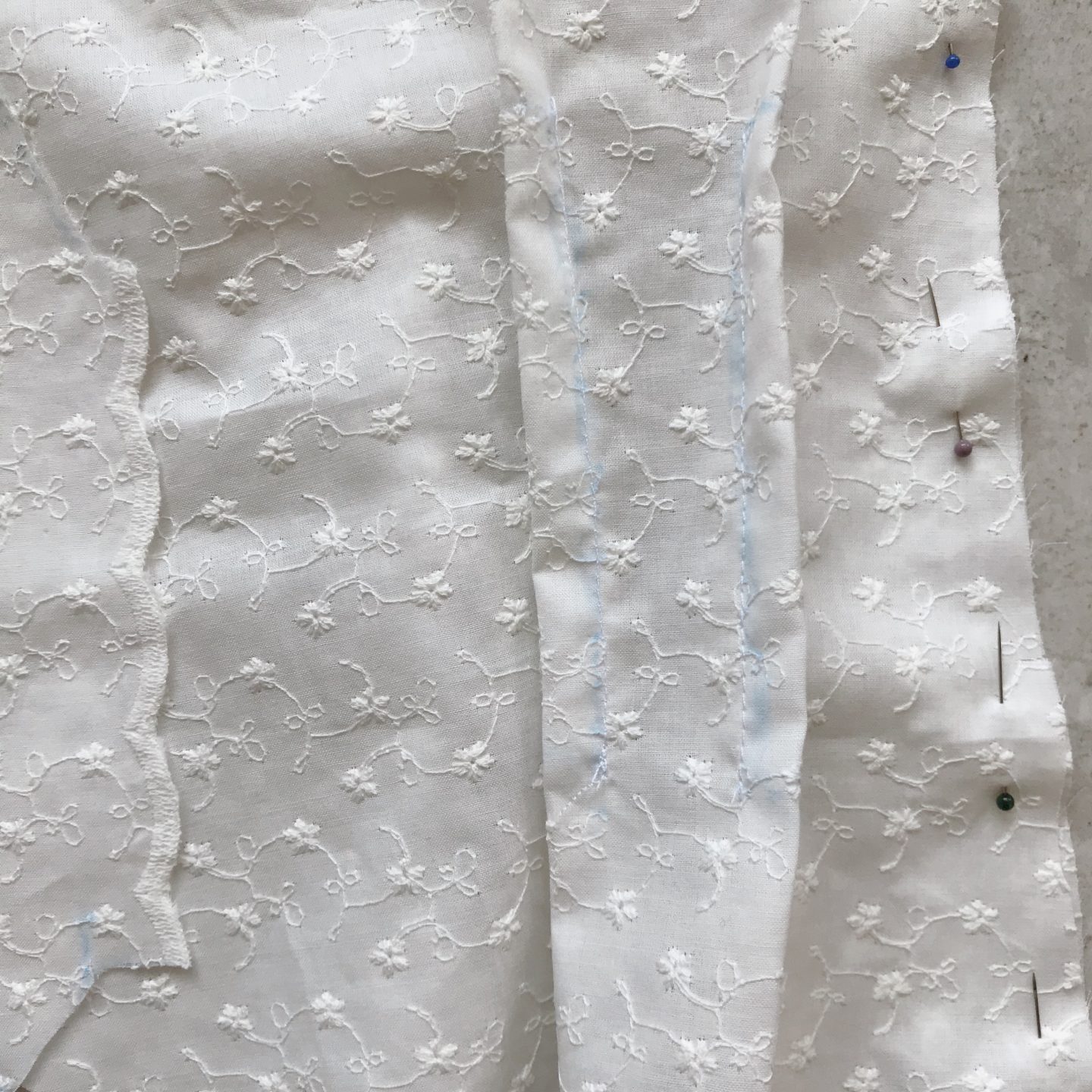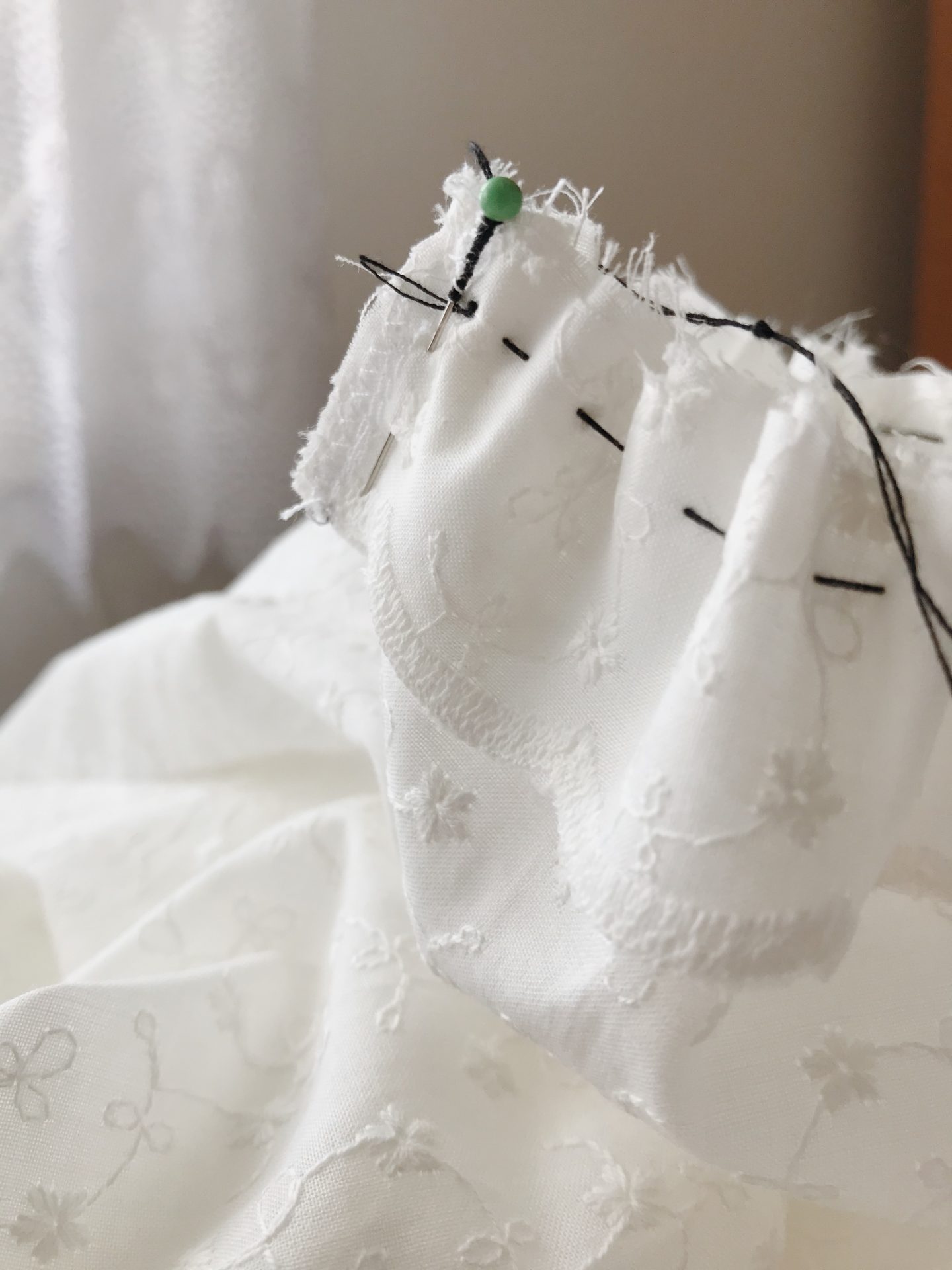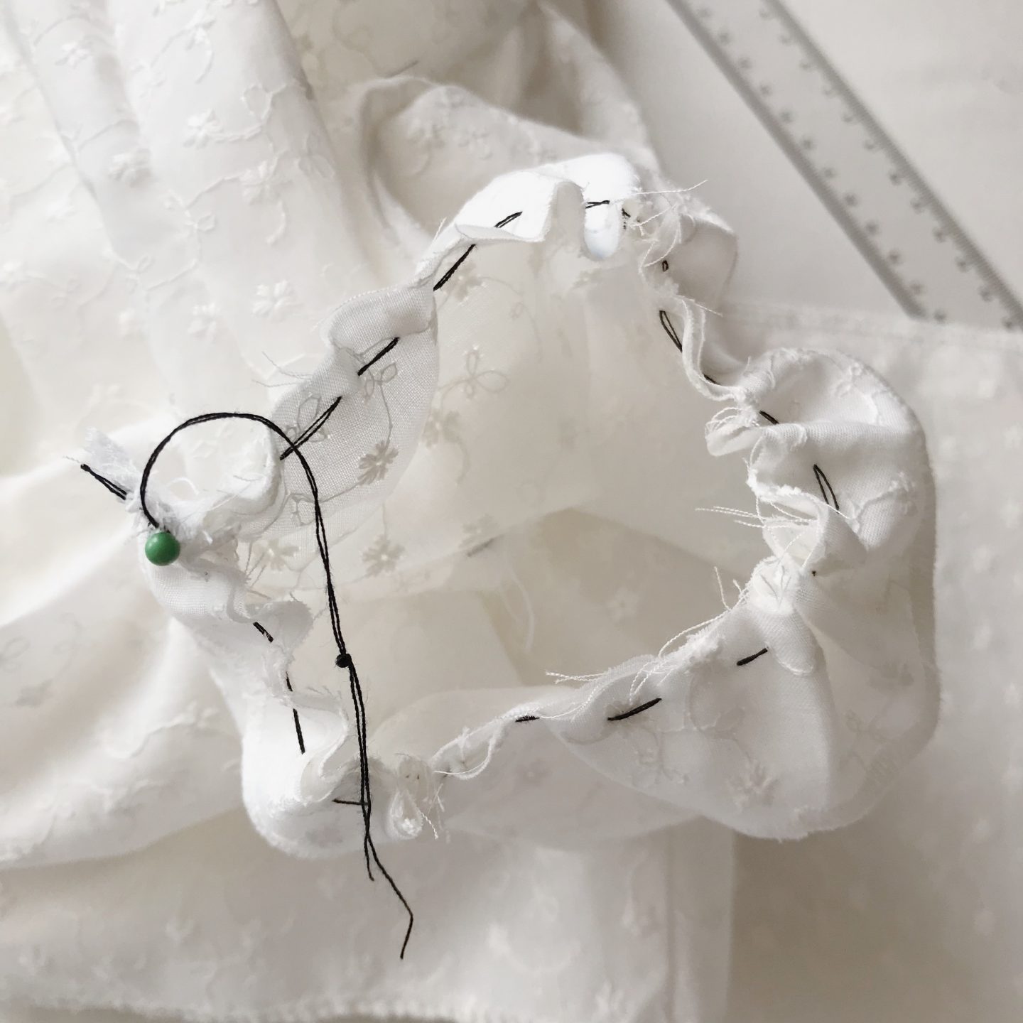 4. Rękawy – w mojej tkaninie wykończenie fabryczne było tak piękne, że nie mogłam go odpuścić. Rękawy wycięłam z nitki prostej a kawałek cienkiego paska o podwójnej długości obwodu rękawa, z wykończenia fabrycznego materiału. Wszystko sfastrygowałam i zmarszczyłam do obwodu mojej ręki, tak by było trochę luzu. ♥️