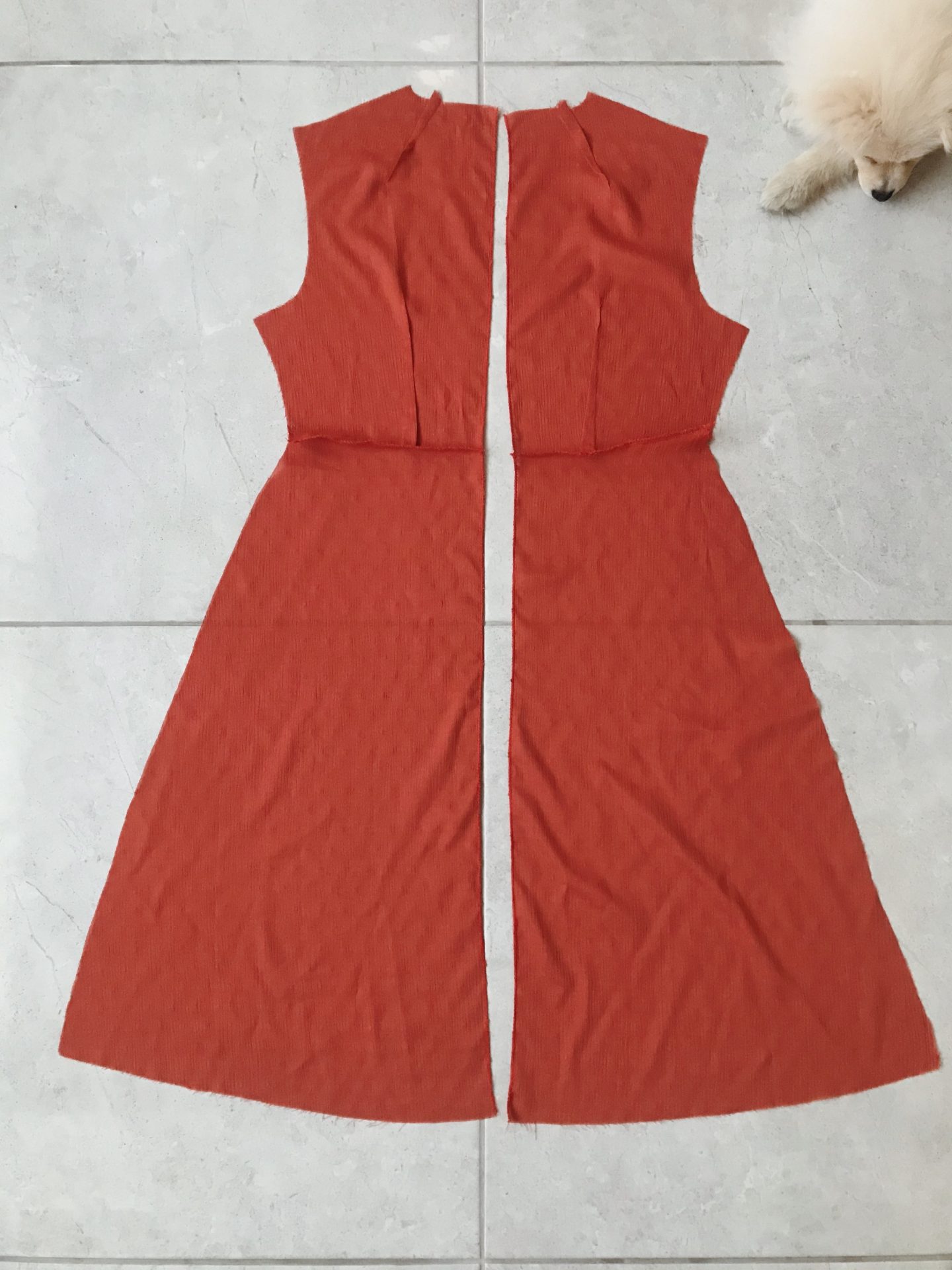 6. Ostatni krok to przód z dwóch części, czyli wszystko przez rozporek. : ) Podwijamy wykończenie rozporka i wszywamy do góry. Pamiętajcie, że długość sukienki regulujecie same. Ja postawiłam na 3/4, ale zastanawiam się nad jej skróceniem. : ) Zszywamy boki. Wszywamy rękawy.
