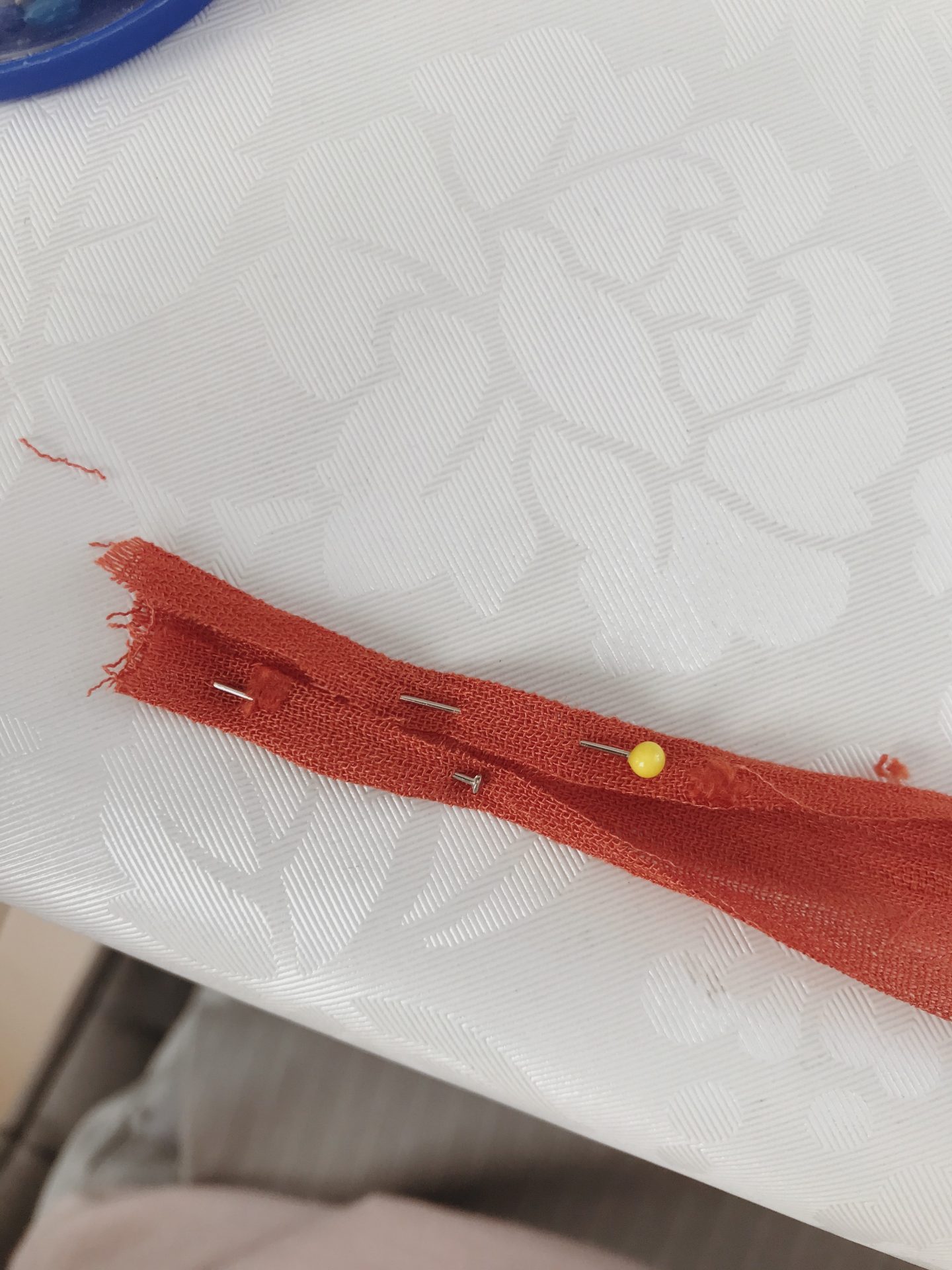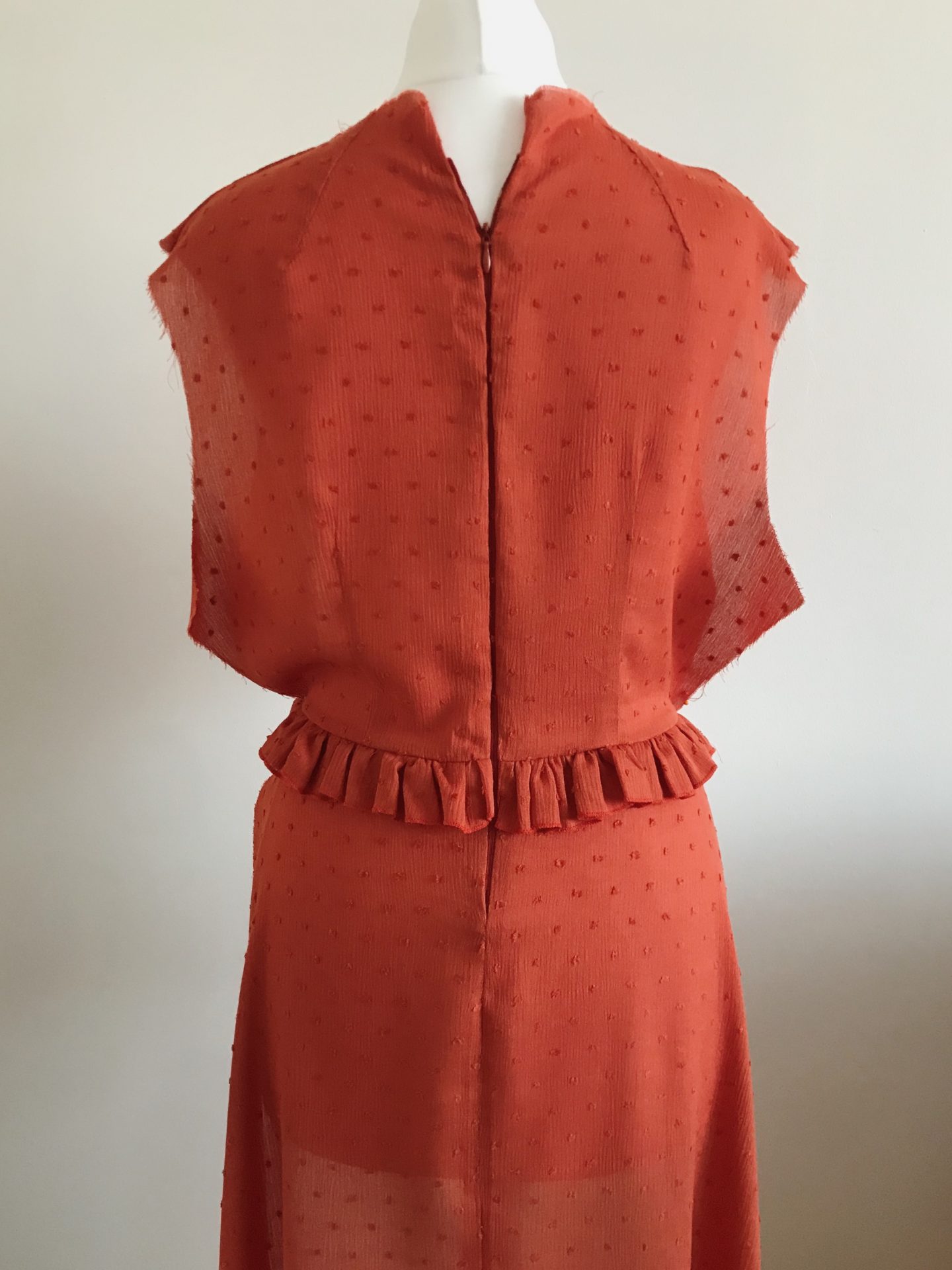 2. Ja zaczęłam od tyłu, dlatego, że łatwiej było mi dopasować szerokość sukienki. Klasyczne zakładki i pasek o podwójnym obwodzie, wykończony z jednej strony mereżką i wszyty do obu stron. Na końcu wszywamy zamek. I tutaj zalecam ostrożność, ja trochę się przeceniłam i nie sfastrygowałam go sobie przed wszyciem, przez co mi “uciekł”
