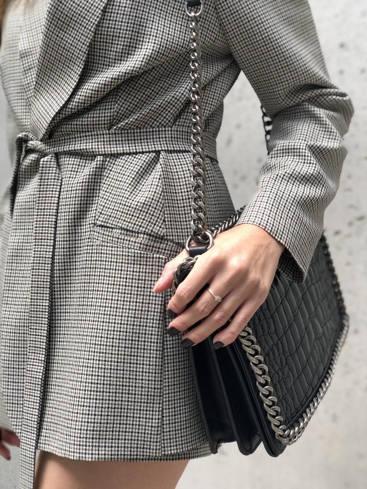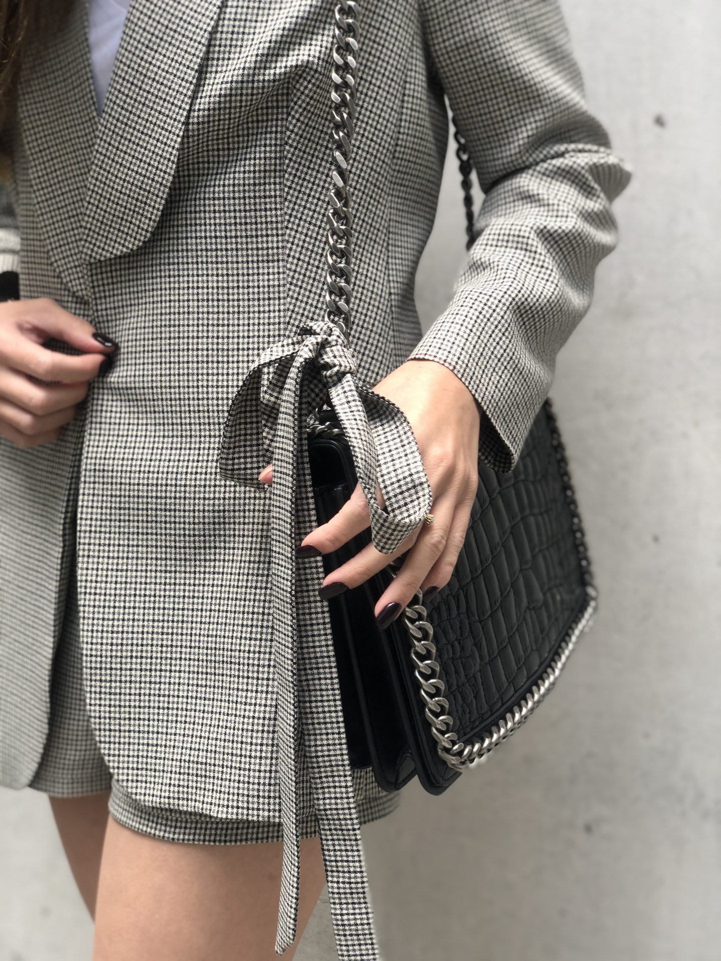 Marynarka Jest niestety z domieszką poliestru… jej główny skład to bawełna. Pozbawiłam ją poduszek, których nienawidzę! (może kiedyś się to zmieni) : ) Ogólnie w samej marynarce jest masa detali, począwszy od kieszeni, przeszycia, zakładki po mini bufki na ramionach i rozporek w tyle. Do tego wszystkiego minimalistyczny, cienki pasek, który przeplatam w talli. Uwielbiam taki efekt. A nosić można z paskiem jak i bez, lub przywiązać do torebki, jak na ostatnim zdjęciu. : ) Klapy szalowe. O ile z samą tkaniną nie było problemu, to z podszewką walczyłam tydzień! Nie obyło się bez pomocy mojej mentorki Oli. <3
